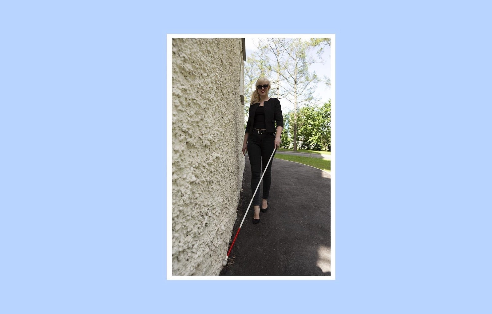 Тифлокомментарий: на голубом фоне цветная фотография в белой рамке. Солнечный день. Светловолосая стройная женщина в черных очках идет по тротуару вдоль фактурной бетонной стены. Белую трость держит по диагонали перед собой, касаясь стены. На ней черные брюки, жакет и туфли на каблуках. Это Марта Любимова. Она улыбается, волосы забраны в низкий хвост сбоку.