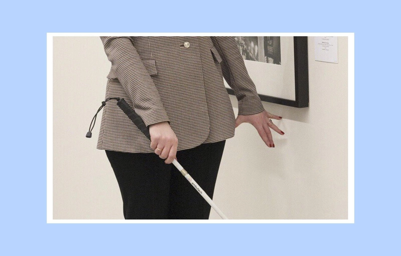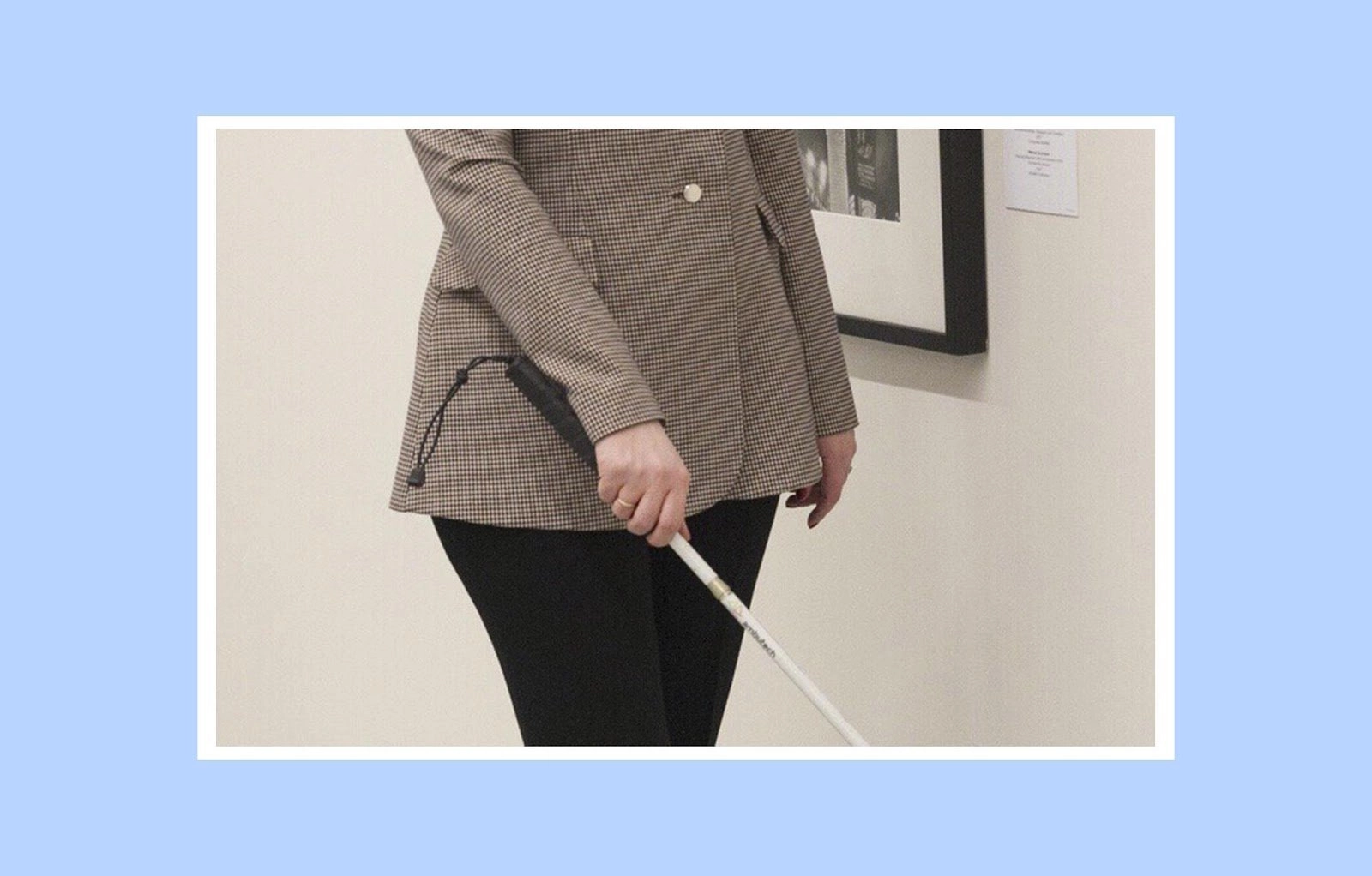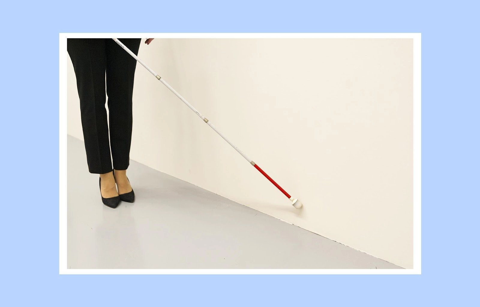 Тифлокомментарий: на голубом фоне цветная фотография в белой рамке. К белой стене на небольшом расстоянии от пола прикасается белая трость с красным нижним сегментом и цилиндрическим наконечником. Рядом на светлом полу женские ноги в черных брюках и элегантных лодочках на каблуках.