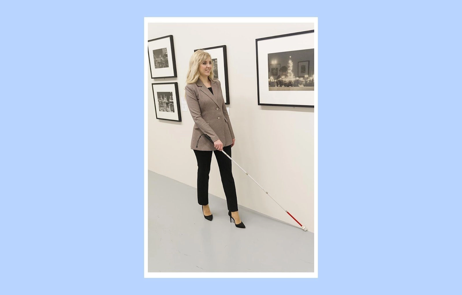 Тифлокомментарий: на голубом фоне цветная фотография в белой рамке. Марта Любимова в черных брюках и бежевом пиджаке идет по белому залу вдоль стены с фотографиями в черных рамах. Белой тростью касается стены. Волосы распущенные, она улыбается.